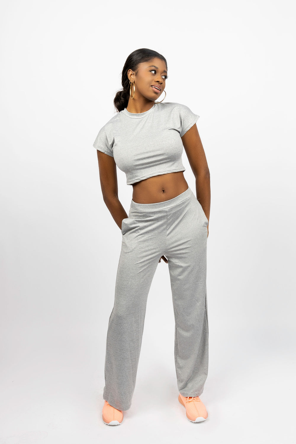 Model wearing gray set is 5'8.5", 34" bust, 26" waist, 37" hips Model wearing berry set is 5'10", 34" bust, 29" waist, 41" hipsBoth models wearing size S
